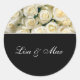 Custom wedding round sticker shown in black with a photo print of pretty white roses.