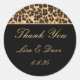 This round wedding thank you sticker is shown in a black and safari leopard print.
