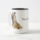 This custom name wedding coffee mug is shown with sample names and a bride and groom art print.