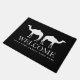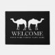 Custom welcome door mat with camel design. Black and white entry rug with personalised family name. Elegant typography with modern animal silhouette. Available in small and large size. Customisable colours.