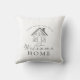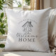 Looking for a unique gift for new homeowners? This customisable "Welcome Home" pillow is a perfect choice. The minimalist design features a charming house with rustic botanical elements, along with the choice to add an address or family name on the curved text on top. It's an ideal closing gift from a realtor or a special way to celebrate a housewarming. The grey design on a soft white cover offers a clean, modern aesthetic, though all colours are editable. © Kimbellished, LLC