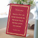 Create your own tabletop sign, politely asking guests to remove their shoes before entering your home. An elegant design featuring classic typography and a simple art deco border. This editable template displays the words 'Welcome, kindly put on shoe covers or remove your shoes upon entering, thank you'. The text can also be customised to suit various purposes. Additionally, you can change the background colour using the design editor tool. Ideal for real estate, open houses, showings, or as a courtesy sign at home to safeguard your flooring! Printed colours: red and gold colour.