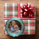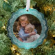 Contemporary classic Christmas holiday season ornament card with ivory cream off-white coloured mandala wreath on a classic ocean blue faux metallic background. With option and room to customise the text, family name and year date, and add a personal photo of your choice on the front, and a customisable season greeting message on the backside of the card.