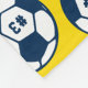 Personalised soccer ball patterned fleece blanket for soccer players to use when they're not scoring goals on the field, and for their parents to support their kids and stay warm at chilly games! Makes a unique team gift for travel tournaments. Design features a pattern of soccer balls that are customised with the player's uniform number. Includes yellow, navy blue, and white colours.
