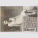 A lady seated on a brick ledge, dressed in a patterned dress with a collar, short sleeves, and a belted waist. She wears ankle-strap shoes and the monochromatic tone suggests it’s an older photograph. The setting appears to be a porch, adding a casual and homely feel to the image. The lady’s attire and posture exude a sense of classic elegance and simplicity.
