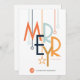 This modern era postcard features a colourful art deco style font with abstract ornaments on a white background with a spot to insert you company logo.