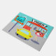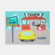 Serve up something special with this Customisable 1950's Diner Door Mat. The cartoon drawing design features a red brick building with blue windows, grey double doors, and a white sign that says, "Diner" perched on the roof. In the parking lot, a second sign is on a pole. The sign has a turquoise background and a flashing red arrow pointing the way to a diner. The customisable sign has done its job because there is a bright yellow car with fins parked next to it. Even though we can't see them, the passengers of the car must be smacking their lips. A cute, young carhop is rollerskating her way to the car. Her brunette hair is in a bouncy ponytail. She is wearing a short, pink uniform with black trim and a white apron. Balanced on one hand, the carhop is carrying a black tray holding a giant hamburger and a refreshing, old-fashioned, glass bottle of soda. The background behind the diner is teal with light blue clouds and the silhouettes of cedar trees.
