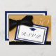 This elegant gold and black bow tie RSVP has a dark blue mortar board and dark blue accent colour. Classy RSVP card for a 50th reunion!