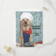 A yellow Lab in an apron, bone bandanna, and chef hat with a pot with chicken legs hanging out. You can use it for a funny postcard or a funny customisable invitation to have friends over when you cook out or BBQ.