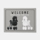 Cute doormat featuring an illustration of the Black and White Poodle. Customisable background colour and texts. Perfect gift for the dog lover or Poodle owner.