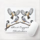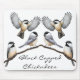 Original fine art design of Black Capped Chickadee birds by artist Carolyn McFann of Two Purring Cats Studio printed on a quality computer mousepad for wild bird fans.