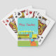 Hey! Wait for me! These Customisable Catching the School Bus Cartoon Playing Cards will get your day off to a great start. It features a cartoon drawing of a child carrying a red, plaid lunchbox while making a mad dash for the school bus. The child is wearing royal blue pants and a turquoise shirt. He is running down an orange, paved sidewalk. The sidewalk is surrounded by the type of green lawn only found in suburbia. There is also a white, picket fence. In the street, we see a vibrant, yellow school bus with aqua windows and glass doors. The name on the side of the bus is customisable. Simply click on the "Customise It" icon to replace the existing text with your own. Don't forget to change the school name on the bus! Behind the bus, we see an aqua sky and the silhouettes of cedar trees. Order it now. You don't want to be tardy!