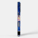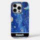 This enchanting phone cover features a heavily textured, painterly abstract design in deep blues, adorned with luminous white stars and crescent moons with soft pink and yellow accents. The artistic, night sky aesthetic adds a dreamy touch to your device. A sleek black bar at the bottom offers personalisation with a name like "Elizabeth"; if you don't want a name, you can remove it and any other elements you don't like from within the design tool, crafting a truly bespoke smartphone accessory.