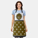 In the middle of the sticker at the top of the apron, the word coffee is written using a coffee cup and coffee beans.