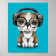This adorable design by artist Jeff Bartels features an English bulldog puppy wearing large Dj headphones. The headphones gives the tiny dog the look that it is about to spin some records or is just relaxing, listening to some music. The small bulldog is also wearing large black rimmed eye glasses which gives the design an intelligent, hipster feel. The background can be customised to any colour you like to personalise it to your style. This cute and unique design is perfect for all animal and music lovers