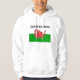 A hooded sweatshirt to customise with a cute Welsh Red Dragon on a green and white background, and 'Wales forever!' in black lettering; from a handpainted watercolour illustration by Judy Adamson.