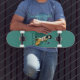 This green dominant skateboard deck features an illustration of bearded man that hugs a cute yellow dog. This is a great gift for a young skateboarder male who owns a dog or who loves dogs in general.
