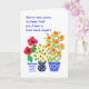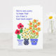 A bright and cheerful greeting card for anyone who is suffering with a bad back, with three pots of colourful flowers, from a handpainted paper collage by Judy Adamson.