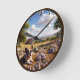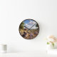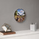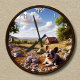 • This customisable clock features a cheerful French Bulldog on a peaceful lakeside with natural rocks, lush greenery, and a cosy cabin in the background.