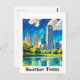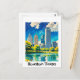 A vibrant watercolor painting of the Houston skyline, featuring iconic skyscrapers The cityscape is framed by a wide avenue lined with lush green trees, creating a sense of urban grandeur and natural beauty. The sky is a clear blue with fluffy white clouds, adding to the overall sense of optimism and energy.