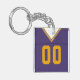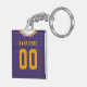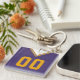 Easy to edit football / lacrosse / sports jersey keychain with front number and back name and number, just use the boxes to the right of the image to insert your own text. This jersey design is in purple with gold and white collar trim, the background 'skin' colour can be changed, just click 'CUSTOMIZE'.