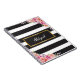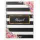 This customisable spiral bound notebook has a black and white striped background with a beautiful floral design in two corners. Such a pretty feminine notebook would make a great gift idea teenage girls and women!