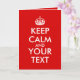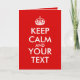 Make customised keep calm greeting cards with this template. It has the keep calm crown logo on the traditional red background. It says Keep Calm and Your Text.