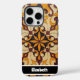 This elegant phone cover features a beautifully textured, embossed mandala-style floral pattern set against a cream-beige background, highlighted with intricate yellow, orange, and deep brown accents. The ornate, tactile design adds a sophisticated, artistic flair to your device. A sleek black bar at the bottom offers personalisation with a name like "Elizabeth"; if you don't want a name, you can remove it and any other elements you don't like from within the design tool, crafting a truly bespoke smartphone accessory.