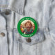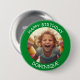 Customisable photo and name happy birthday button. Green frame with white font.