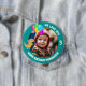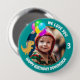 Customisable photo, name, age and text - HAPPY BIRTHDAY / WE LOVE YOU - button. Teal frame with white font and a cute dino is holding balloons. Adorable keepsake.