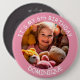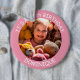 Customisable photo, name and age - IT'S MY BIRTHDAY - button. Ligth pink frame with white font.