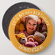 Customisable photo, name and age - IT'S MY BIRTHDAY - button. Orange frame with white fonz.