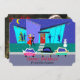 These Customisable Retro Holiday Cartoon Photo Cards will put you in the holiday spirit. The design features the exterior of a mid century modern house. Through the floor to ceiling turquoise glass walls, we can see the navy blue silhouettes of festive party goers. There is a couple chatting in front of a green Christmas tree, which is decorated with teal ornaments. On the opposite side of the room, we can see a dancing man and the long-winded man everyone is trying to avoid. The exterior of the house features a cheery red door with a holiday wreath, an oversize purple brick fireplace, and strands of colourful Christmas lights. A grey walkway is cutting a swath to the front door, through the teal grass. The nighttime scene has a dark blue sky with a yellow, crescent moon. The plastic snowman decorating the front yard is being greeted by the first snow flurries of the season. An attractive couple is doing the cha-cha-cha on the way to their car. The blonde woman is wearing a bright red dress. She is holding a sprig of mistletoe in one hand. Her handsome escort is wearing a black suit and a red tie. His hands are wrapped around the woman's waist. On the street, in front of the house, we can see three, brightly coloured classic cars. Personalise with your special holiday message. The opposite side of the card is ready for you to replace the template photo with one of your own. There's even room to personalise the year. Photography © Storytree Studios, Stanford, CA