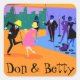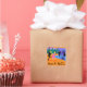 These Customisable Retro Urban Rooftop Party Stickers are intoxicating in their detail. The cartoon design features the type of wildly sophisticated cocktail party that is normally only seen in movies from the 1960s. There is a lot for the partygoers to take in. From the comfort of a penthouse apartment, guests are enjoying the view and the ambiance. The lighting sets the mood and we are able to see the darkened silhouettes of an attractive couple dancing the cha-cha. On the floor, there is a purple, portable, record player at the feet of the dancing couple. Several albums have been scattered nearby. Even with the dimmed lighting that makes practically everything in the room appear in shades of purple, blue and black, we can tell that everyone is dressed to the nines. Behind the dancing, indoor couple, there is a gentleman in a black suit holding a martini glass. He is talking to a dark haired beauty who is standing near one of the floor to ceiling glass walls. From a lampstand, a single bulb is casting a romantic glow on the scene. The only thing missing is the lampshade. Hmm... Where is the shade? It's on the head of a tipsy man who has taken the party outside to the orange rooftop. He's clearly got some fine dance moves and he isn't afraid to show them to the world! His companion is a shapely, blonde woman in a bright pink dress. Her back is arched as she throws back her martini in an uninhibited fashion. Beyond the party, there is a breathtaking teal skyline, complete with skyscrapers and a purple sky. Personalise for your occasion. If this is how the other half lives, sign me up!