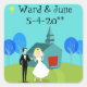 These Customisable Retro Wedding Couple Stickers will have you hearing wedding bells. The 1960's style, minimalist art design features a bride and groom on their wedding day. The happy couple looks good enough to be standing atop a wedding cake. But they aren't. They're standing on lush, green grass. The debonaire Mr. is wearing a classic, black tuxedo with black bow tie. Down, ladies! He's taken! He is holding the hand of his beautiful Mrs., who looks positively radiant in her tea length, white gown with form fitting waist and flared skirt. She truly looks like a princess with her tiara and gauzy, white wedding veil resting on her pretty blonde head. Beside them, a path in the grass leads to the world's most charming chapel. The quaint, teal and turquoise church is the perfect setting for saying, "I do!" Yes, here is the church. Here is the steeple. We can only assume that, behind those bright red, double doors is a roomful of people just waiting to share in this couple's happiness. The picturesque setting also includes four, stylistic, cartoon trees in shades of blue. It's a beautiful day for a wedding, as we can see from the flawless aqua sky. The only thing missing from this mid century modern design is the rice, and we can assume that will be forthcoming. Personalise with names and date. This design can be used for save the date cards, wedding thank you notes, informal invitations, and for congratulating your favourite newlyweds.