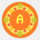 Round stickers with a yellow floral border. Add your initials, monogram, name, any text you like. You can also change the background colour from orange to anything you like.