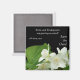 A pretty 'Save the Date' fridge magnet for you to personalise, with a sprig of fragrant Mock Orange Blossom, on a black background, from a photograph by Judy Adamson