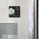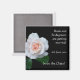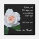 A pretty 'Save the Date' fridge magnet for you to personalise, with a pale pink rosebud, 'New Dawn', on a black background, from a photograph by Judy Adamson