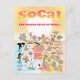 Colourful view of Southern California - wacky characters frolic on the beach and desert of SoCal showcasing Los Angeles, Orange County, Santa Barbara, San Diego, Riverside, Palm Springs, Anza Borrego and Joshua Tree parks - also the border cities of Tijuana, Tecate and Mexicali. This SoCal map has it all – a surfer hangs ten, a killer whale leaps out of the water, zoo animals greet the tourists, a beach couple play in the surf as a T-Rex roars a challenge and a tank rumbles into position and much more…