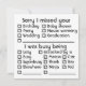 The most common reasons are already listed to save you time from writing it, and you just check the box; Superbusy? already listed. Moose attack? Shark? Ninja? already listed! Or add your own reason; either in the edit on Zazzle, or in writing later! Enjoy, you're welcome