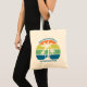 These cool personalised tropical beach sunset tote bags feature 3 palm trees silhouetted against an orange and blue sky accented with yellow and green at the coast. Customise for great family trip keepsake gifts for your coastal getaway this spring break or summer or ocean cruise vacation.