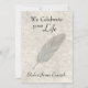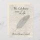 Feather on Stone Effect for Life Celebration Whether you are holding a living funeral or the wake of one recently passed, or commemorating with a gathering on an anniversary, these invitations let others know about the occasion. Celebrate a life and share special memories. The parchment or stone effect on the front of this card has a slight sepia tone and features a painted feather design in soft shades of grey. Fully customisable, you simply complete the boxes with the personal details for a personalised invite.