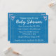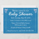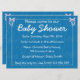 Personalise Blue Baby shower invitation with white frame and two cute little bows on the top of each corner. In the back it's repeatable pattern of text Baby Shower.