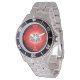 Has heft and feel of expensive stainless steel quartz watches. Good band with safety catch. I removed links, which is easy because engraved arrows show direction to push the linking pins. As always by this seller, the image (a railroad logo) is a perfect reproduction of my emailed image, and is precisely spaced and aligned.
