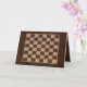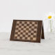 This customisable greeting card design features a rich dark wood veneer with an inlaid eight by eight square chequered board of alternating decorated brown and cream tiles representing the dark and light squares of a chessboard, draughts board or checkers board.