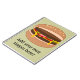 Add a slogan or name to create a personalised gift with a hamburger theme. Image shows a double cheeseburger with melted cheese, tomato rings and gherkin.