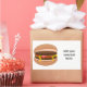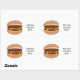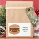 Add a slogan or name to create a personalised gift with a hamburger theme. Image shows a double cheeseburger with melted cheese, tomato rings and gherkin.