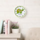 Customise this cute children's wall clock with your child's name. Large easy-to-read numbers surround a smiling baby turtle. Great gift for a new parent or for a young child. White clock face colour with green accents.