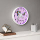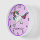 Customise this cute children's wall clock with your child's name. Large easy-to-read numbers surround a smiling baby unicorn. Great gift for a new parent or for a young child. White clock face colour.