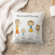 American MOJO pillow with customisable stick figure family including a dad, mum, girl, and baby boy on front, colourful circles print on back.